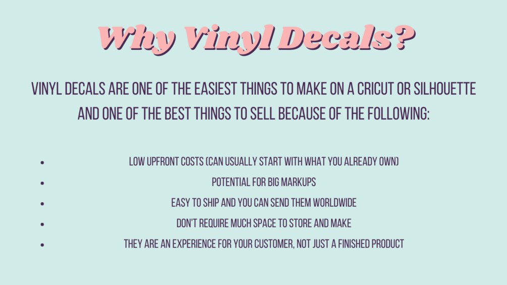 It will however go over the key things to think about when starting a business and will give you a very general overview of where to begin. I won’t be teaching where to sell your decals or how to get sales in this course.